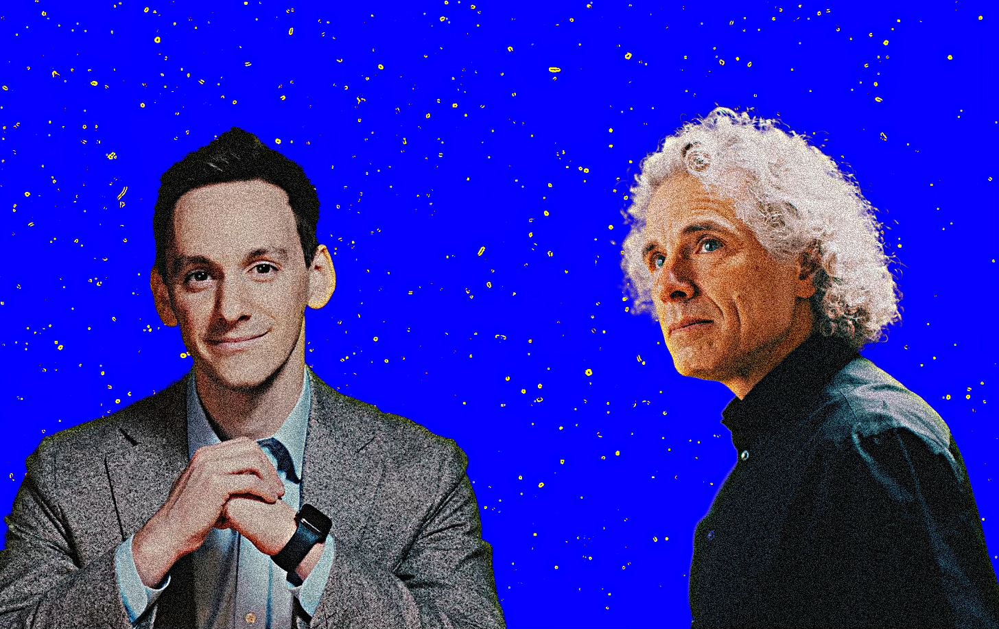 is a progressive who has been writing a lot about if and when progressive governance went wrong and how to set it right. He is the co-author, with , of the #1 New York Times bestselling book Abundance. He also the author of the Derek Thompson newsletter, the host of the Plain English podcast, and a contributing writer at The Atlantic. is an experimental psychologist at Harvard, and defies easy characterization. He is, in a sense, a really, really old-fashioned liberal who believes in reason, science, and humanism. Imagine that? He has done seminal work showing how by tapping into the better angels of human nature, the Enlightenment has resulted in massive reductions in violence and delivered stability vital to improving the human condition. From this vantage point, he has criticized progressives, conservatives, and, most recently, heterodox thinkers as well. He is a two-time Pulitzer Prize finalist, a Humanist of the Year, a recipient of nine honorary doctorates, and one of Time’s “100 Most Influential People in the World Today.” His latest book is When Everyone Knows That Everyone Knows …Derek and Steve will offer a critique of various shades of contemporary liberalism, including their own, and discuss what a renewed and revitalized liberalism would look like.
