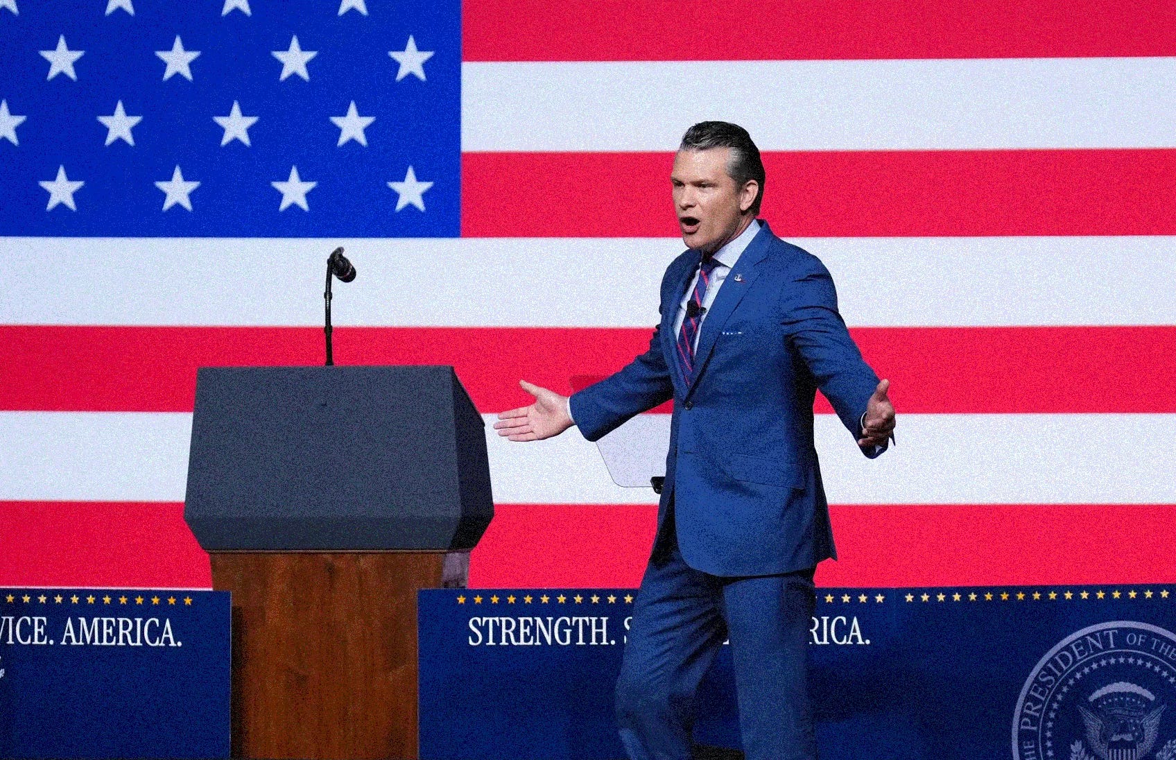 While Hegseth’s speech didn’t hit this theme, it formed the crux of his boss’ address: the president told the assembled senior officers that “America is under invasion from within,” that “some of the people in this room” will need to wage war in blue cities like San Francisco, Chicago, New York City, and Los Angeles in order to “straighten them out,” and even that such operations—carried out by U.S. armed forces against Americans on American soil—could function as “training grounds for our military.”